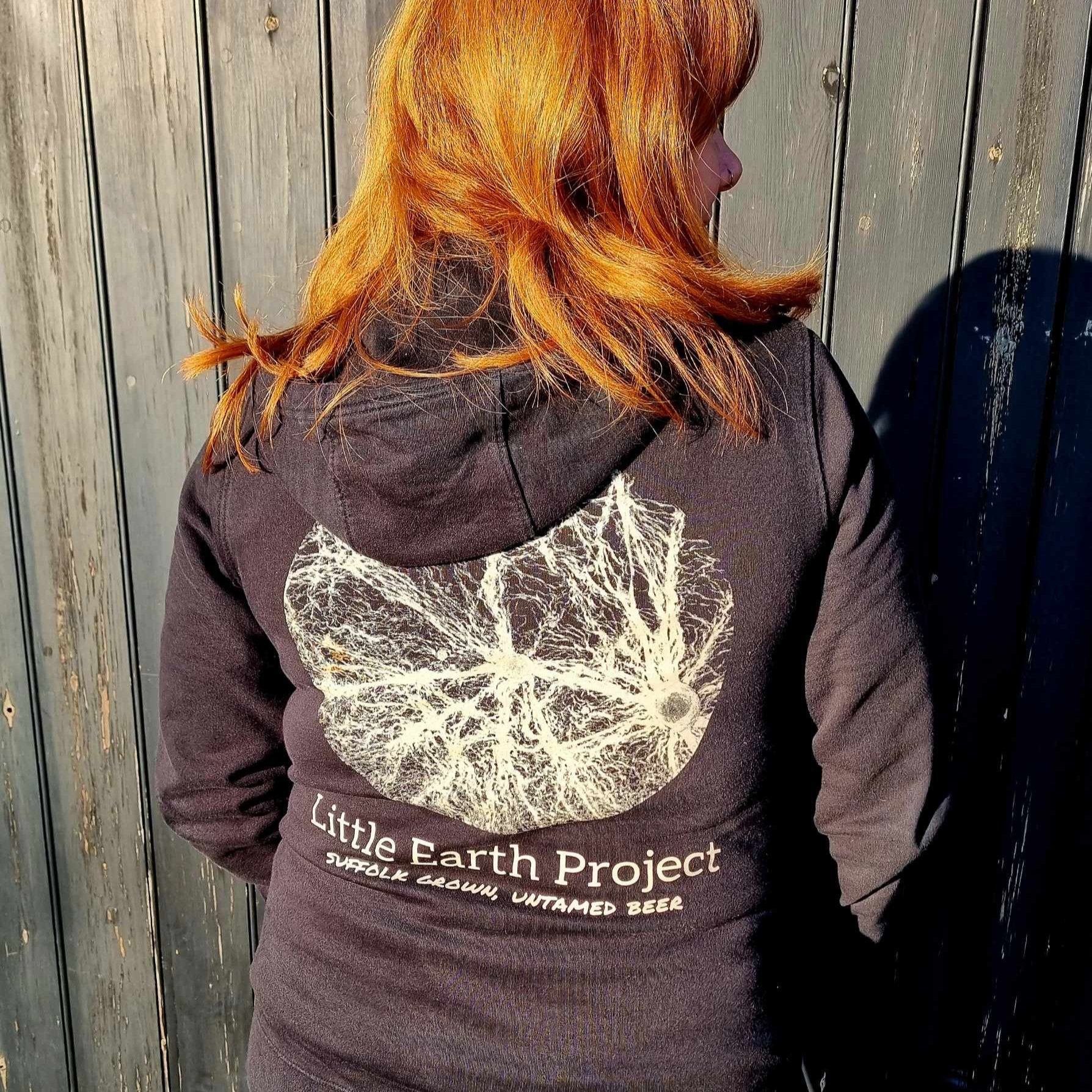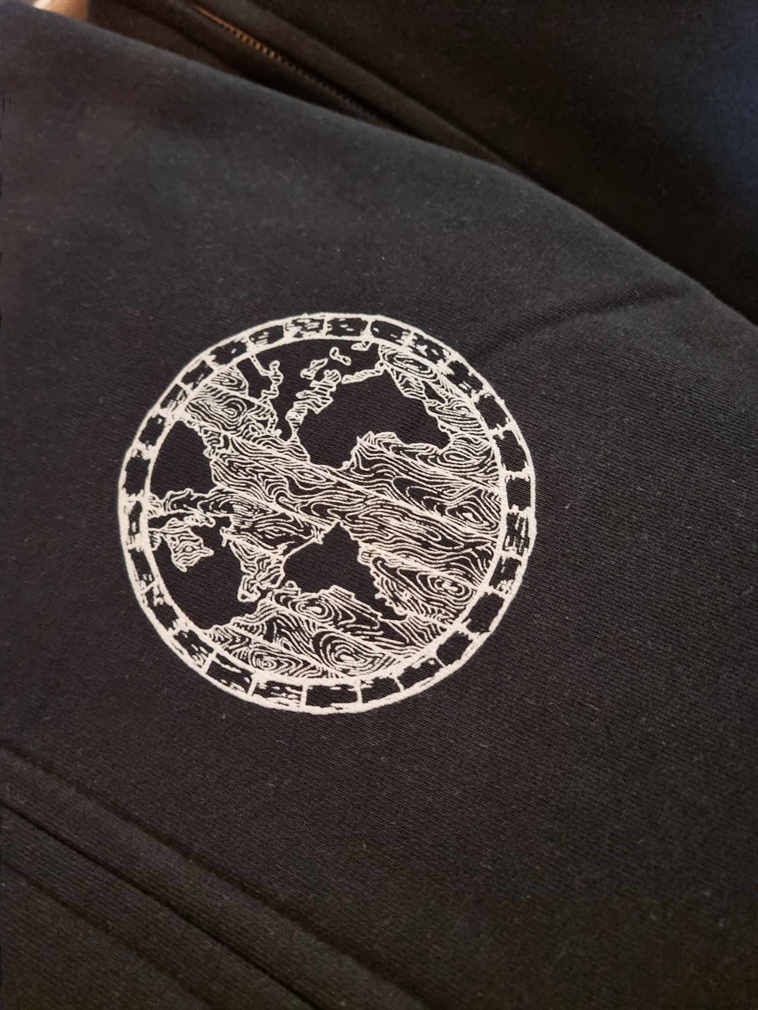 Black Zip Hoodie with Earth Logo on front right chest and pellicle design on back.